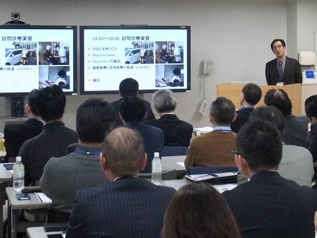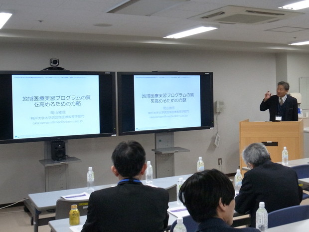 今年度は3月10日(土)に、九州大学病院ウエストウイング棟3階 スキルトレーニングセンターにて開催しました。住本医学研究院長の開会挨拶に引き続き、神戸大学大学院地域医療教育学部門 特命教授 岡山雅信先生より「地域医療実習プログラムの質を高めるための方略」と題してご講演をいただきました。その後、実習施設のうち5施設より、参加型実習に積極的に取り組んでいる部署のご報告をいただきました。最後に、今年度の各施設での参加型実習の問題点、ならびに次年度に向けての改善点について6つのグループに分かれて議論し、グループ毎に発表をしていただきました。