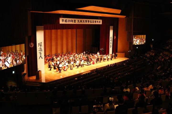 九大フィルハーモニーオーケストラによる祝賀演奏の後、10時10分から行われた学士学位記授与式では、医学科6年生の山口修輝さんが医学部卒業生総代として、住本医学部長による課程修了認定を受けて、久保総長から学位記を授与されました。