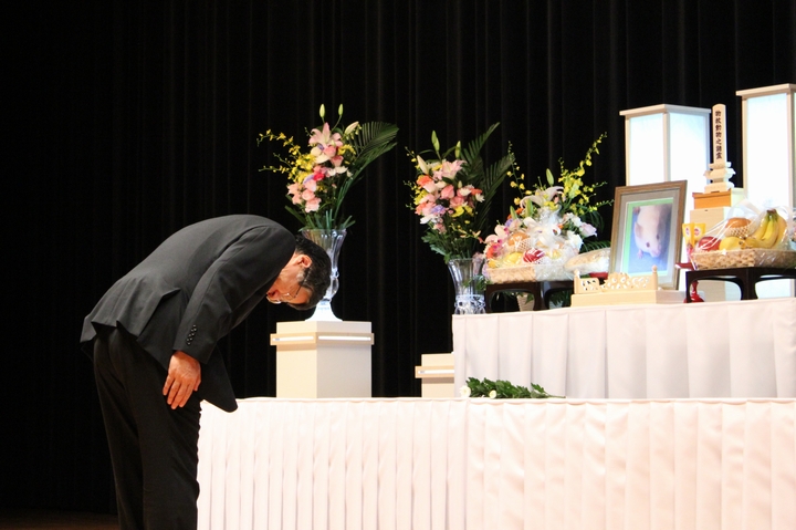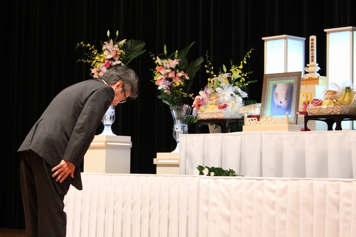 約260名の教職員・学生が参列し、始めに参加者全員で黙祷を行った後、住本研究院長から「慰霊の言葉」が述べられました。引き続き、小野動物実験施設長から弔辞があり、動物実験施設長は「今後とも、動物実験に従事する私達は、国内外の規制の動向や科学的知見に関する情報の収集に努め、3R(代替法の選択、使用数の削減、 苦痛の軽減)と実験動物学の三大統御(環境統御、微生物統御、遺伝統御)を実践することで、 実験動物の福祉の実現と動物実験の再現性確保に取組む所存である。」と述べられました。