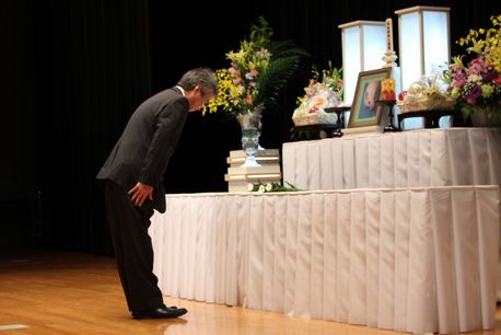 約220名の教職員・学生が参列し、始めに参加者全員で黙祷を行った後、北園研究院長から「慰霊の言葉」が述べられました。引き続き、小野動物実験施設長から弔辞があり、動物実験施設長は「今後とも、動物実験に従事する私達は、国内外の規制の動向や科学的知見に関する情報の収集に努め、3R(代替法の選択、使用数の削減、 苦痛の軽減)と実験動物学の三大統御(環境統御、微生物統御、遺伝統御)を実践することで、 実験動物の福祉の実現と動物実験の再現性確保に取組む所存である。」と述べられました。