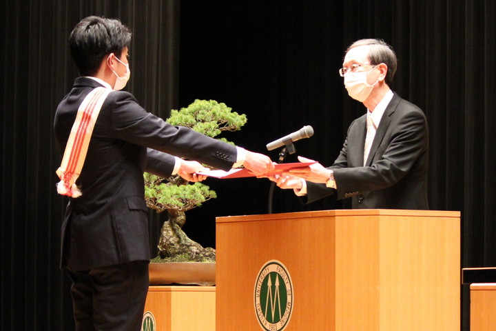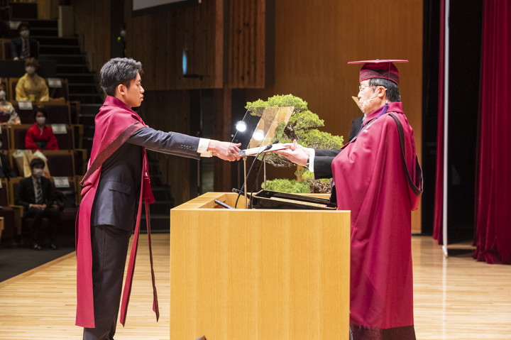 本年度は、新型コロナウイルスの感染が拡大している国内の状況に鑑みて、卒業生・修了生、保護者の皆様が一堂に会しての式典は行わず、出席は各学部の総代12名と大学院総代3名、および事前申し込みによる参加希望者のみに限り、学部の式典は2部制にして開催しました。