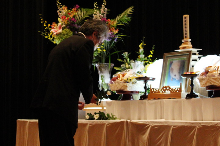 約250名の教職員、学生が参列し、始めに参加者全員で黙祷を行った後、北園研究院長から「慰霊の言葉」が述べられました。 その後、参加者全員で献花を行い、動物慰霊祭を終えました。
