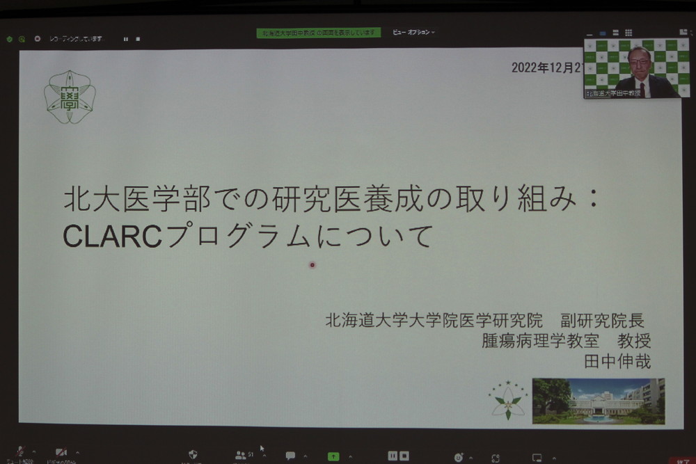 はじめに、大分大学医学部神経生理学講座 花田 礼子教授の講演、「大分大学医学部におけるシームレスな若手研究者育成の取り組み:ORPhDならびに基礎研究医プログラムについて」がありました。質疑応答の後、休憩をはさみ、北海道大学大学院医学研究院腫瘍病理学教室 田中 伸哉 教授の講演、「北大医学部での研究医養成の取組:CLARCプログラムについて」がありました。 田中教授の講演の質疑応答の後、花田教授にも画面に登場して頂き、今回のFD全体の質疑応答がなされました。