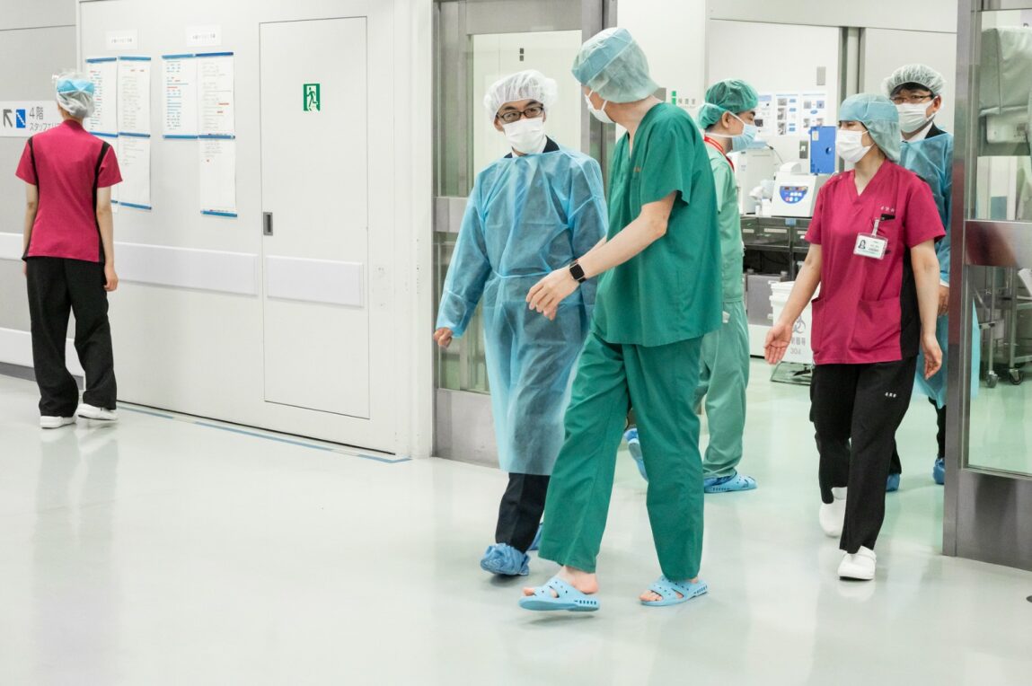 続いて、手術部において手術支援ロボット「ダヴィンチ」や九大が民間企業等との共同研究で開発した眼内内視鏡・眼内照明保持ロボット「OQrimo(オクリモ)」の説明を受けられた後、生体防御医学研究所にて、高精度病理診断を可能とする空間オミクス研究に関する説明を受けられました。