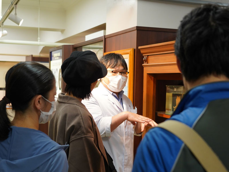 その後は、参加者それぞれが興味のあるエリアや肉眼臓器標本を自由に見学できる時間となり、案内を担当した6名の病理スタッフ(病理専門医)はそれぞれ参加者の医学的な疑問や質問に答え、肉眼臓器標本の病態について詳しく説明するなど、交流を深めました。