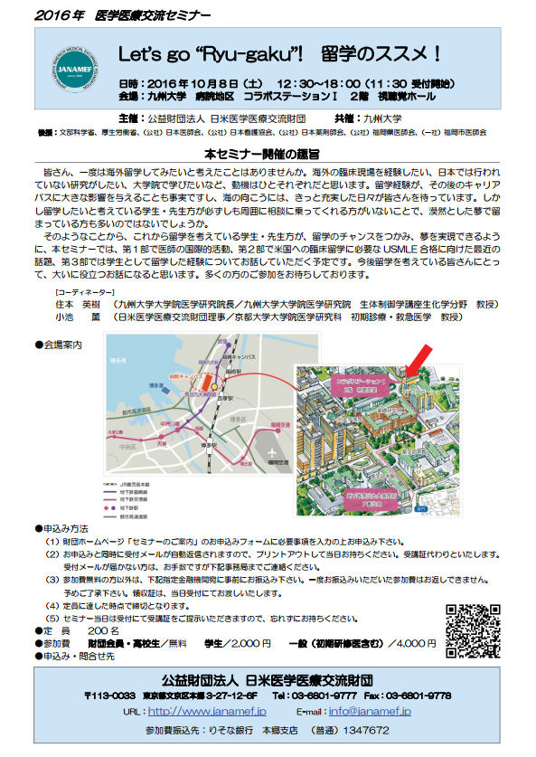 公益財団法人 日米医学医療交流財団の主催で、海外留学を希望する学生、医師の先生方に向けたセミナーを九州大学 病院地区で開催します。詳しくはセミナー情報をご確認ください。