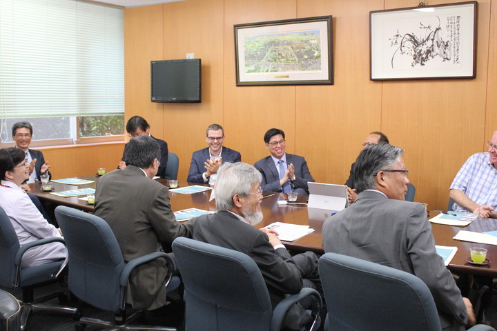 King Li医学部長は、はじめに伊都キャンパスにおいて久保総長を表敬訪問され、その後、工学研究院、システム情報科学研究院とのミーティングが行われました。昼食をはさみ、13:00から病院キャンパス 医学研究院長室にて、医学研究院への表敬訪問が行われました。表敬訪問には若山理事らも同行され、医学研究院からは、住本研究院長、康副研究院長、加藤副研究院長、橋爪教授、伊藤教授が参加しました。