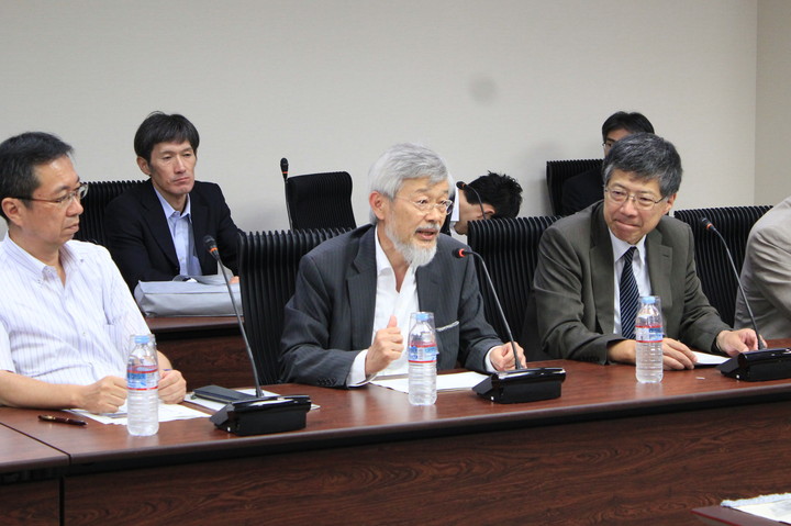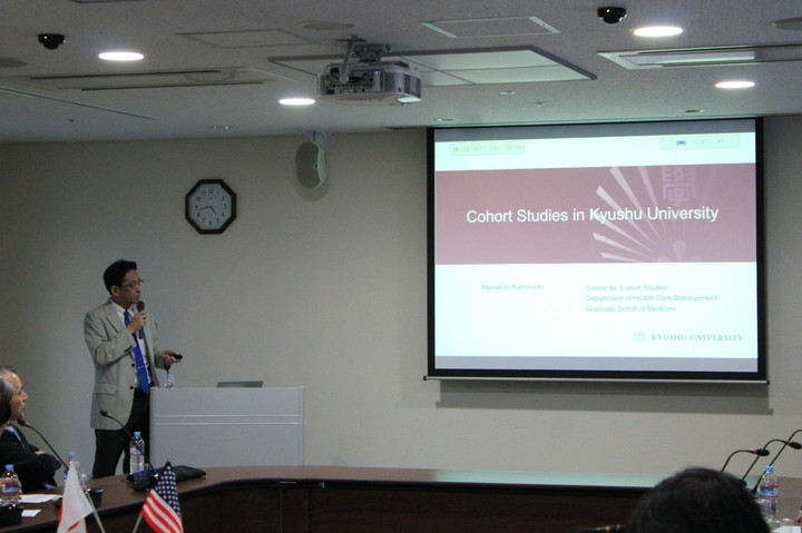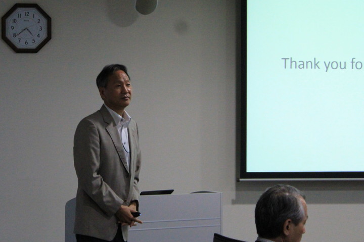 つづいて、意見交換会の場が設けられ、九州大学側からの話題提供として、三浦教授、清水教授、康副研究院長、鴨打教授が、それぞれ自身の研究内容についてスライドを交えて説明されました。イリノイ大学の各教授からも多くの質問やご意見を頂き、活発な意見交換会となりました。