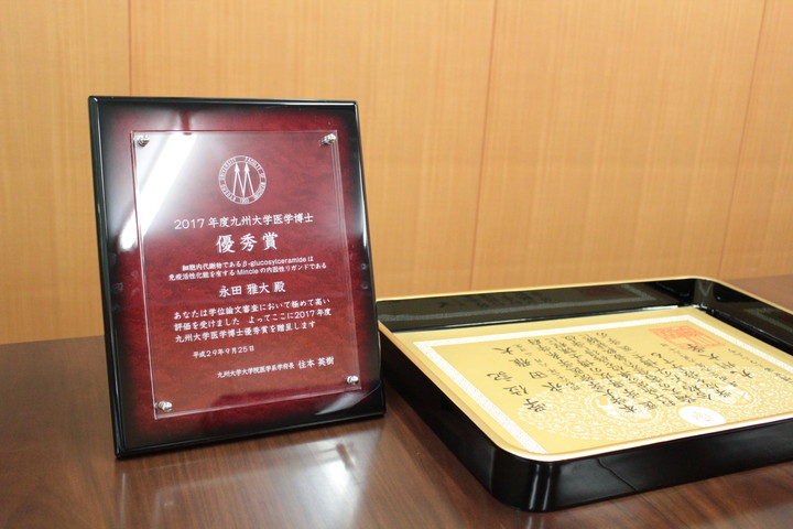 2017年度前期において「九州大学医学博士優秀賞」として永田雅大さんが表彰されました。九州大学医学博士優秀賞は、博士論文審査で極めて高い評価を受けた者を表彰するものです。永田さんは山崎晶教授(生体防御医学研究所 分子免疫学分野)の指導を受け、論文タイトル「細胞内代謝物であるβ-glucosylceramideは免疫活性化能を有するMincleの内因性リガンドである」で高評を得ての表彰となりました。