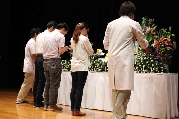 約260名の教職員・学生が参列し、始めに参加者全員で黙祷を行った後、住本研究院長から「慰霊の言葉」が述べられました。引き続き、小野動物実験施設長から弔辞があり、動物実験施設長は「今後とも、動物実験に従事する私達は、国内外の規制の動向や科学的知見に関する情報の収集に努め、3R(代替法の選択、使用数の削減、 苦痛の軽減)と実験動物学の三大統御(環境統御、微生物統御、遺伝統御)を実践することで、 実験動物の福祉の実現と動物実験の再現性確保に取組む所存である。」と述べられました。