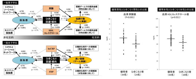 今回、ひきこもりに関連する生物学的基盤を探索するために、ひきこもりではないボランティア(大学生)と九州大学病院ひきこもり研究外来を受診したひきこもり者から採血を行い、探索した血中物質のうち、血中の炎症関連マーカー(高感度 CRP・FDP)の高値や尿酸・HDL コレステロールの低値が、男女それぞれ違う形で、ひきこもり傾向に関連していることを発見しました。さらにこれらの血中物質は、他者への協力や信頼といった向社会的行動とも関連していることが、「信頼ゲーム」とよばれる経済ゲームを使った行動実験により明らかになりました。