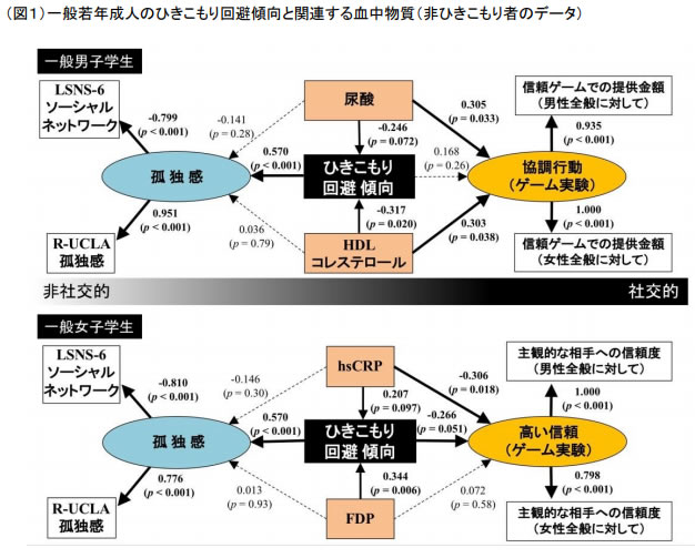 本研究は、ひきこもり傾向に生物学的因子が関連する可能性を示唆する初めての報告です。今回の 2つの研究により、ひきこもり傾向に関する血中物質候補を幾つか発見することができました。血中の炎症関連マーカー(高感度 CRP・FDP)の高値や尿酸・HDL コレステロールの低値がひきこもり回避傾向に関連していました。