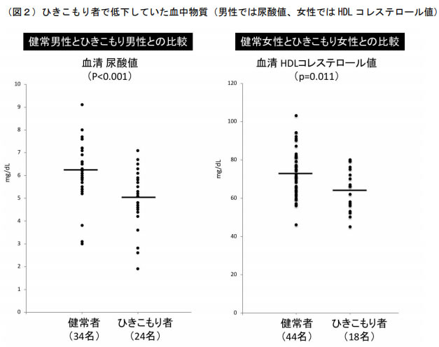現在 6 ヶ月以上のひきこもり状況にある男性 24 名、女性 18 名と、年齢をマッチさせた健常者(男性34 名、女性 44 名)の血中物質の値を比較したところ、男性のひきこもり者では健常者と較べて尿酸の値が有意に低下しており、女性のひきこもり者では健常者と較べて HDL コレステロールの値が有意に低下していました(図2)。