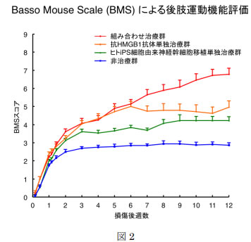 そこで研究グループは、この二次損傷を何らかの方法で抑制し、損傷部ダメージを軽減した上で神経幹細胞を移植すれば、さらに高い効果が得られるのではないかと考えるに至った。今回、損傷部環境を改善・整備する方法として、抗HMGB1抗体の投与を選択した。HMGB1は非ヒストン性のDNA結合タンパクとして核に存在するが、 脳虚血・挫傷により細胞外へ放出される。放出されたHMGB1は、血管内皮細胞や血管周皮細胞に作用して血液-脊髄関門の破綻が生じ、 浮腫やさらなる炎症反応を誘導し、損傷部の破壊を進行させると考えられている。このような状況の中、共同研究者の西堀らは、HMGB1の作用を抗HMGB1抗体により阻害したところ、脳虚血・挫傷後の二次損傷が劇的に抑制出来ることを突き止めた(Liu K et al., FASEB J 2007, Okuma Y et al., Ann Neurol 2012)。同じ中枢神経系である脊髄における損傷でもHMGB1は同様に作用している可能性は高いと考えられ、本研究ではまず抗HMGB1抗体を脊髄損傷モデルマウスに投与することで後肢運動機能を改善できるかどうかを検証した。さらにヒトiPS細胞由来神経幹細胞の移植を併用させることにより、移植細胞の挙動を観察し、抗体もしくは移植単独治療よりさらに後肢運動機能改善が見られるかどうかを検討した。