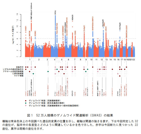 理化学研究所(理研)統合生命医科学研究センターの久保充明副センター長、統計解析研究チームの鎌谷洋一郎チームリーダー、大阪大学大学院医学系研究科遺伝統計学の岡田随象教授および九州大学大学院医学研究院衛生・公衆衛生学分野の二宮利治教授、秦淳准教授らの国際共同研究グループ※は「MEGASTROKEコンソーシアム[1]」の一員として、世界中から集めた52万人規模の遺伝情報を用いてゲノムワイド関連解析(GWAS)[2]を行い、22の新規座位[3](遺伝的変異[4])を含む32の脳卒中に影響する座位を同定しました。脳卒中は世界で2番目に死亡者が多い疾患です注1)。脳卒中は大きく虚血性(脳梗塞)と出血性(脳出血、くも膜下出血)に分かれ、脳梗塞はさらにアテローム血栓性脳梗塞、心原性脳梗塞、ラクナ梗塞などの亜型に分類されます。しかし、発症の分子レベルのメカニズムはいまだにあまり分かっておらず、新しい治療法の開発が進んでいません。