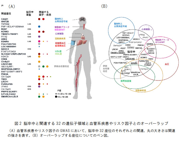 また、過去に行われたさまざまな他の血管系疾患や血管リスク因子のGWASと比較したところ、今回同定した32の座位は血圧(5座位)、冠動脈疾患(5座位)、心房細動(2座位)、血栓塞栓症(2座位)、LDLコレステロール(2座位)、頸動脈プラーク(1座位)、白質高信号域(1座位)と関連していることが分かりました(図2)。これは、脳卒中とさまざまな血管系疾患や血管リスク因子とを分子レベルでつなぐ情報を得たということであり、今後の病気のメカニズム解明のために大きく活用されることが期待できます。