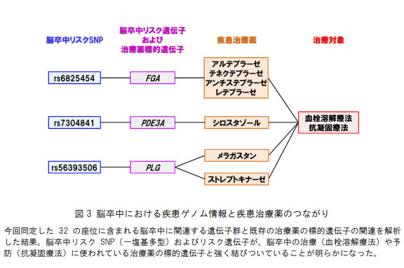 ータベース上に登録された既存の治療薬の標的遺伝子とのつながりを、網羅的に検討しました。国際的な疾患治療薬分類基準である解剖治療化学分類法[10]との照合の結果、脳卒中に関連する遺伝子群は、数ある治療薬の中でも、脳卒中患者の急性期治療や脳梗塞の予防治療に用いられる治療薬(抗凝固療法および血栓溶解療法)と、特に強い結びつきを持つことが明らかになりました(図3)。これは、疾患ゲノム解析の成果に基づく新たなゲノム創薬につながる画期的な成果です。
