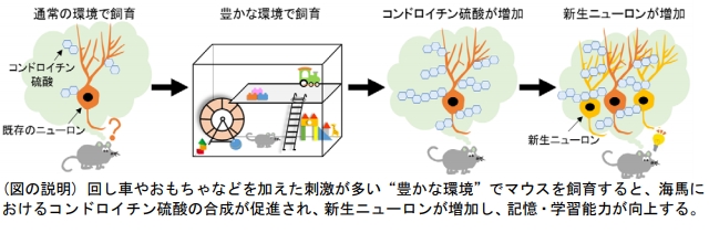 認知と情動の中枢である海馬では、脳の大部分の領域とは異なり、発達後もニューロンが生み出されています(成体海馬神経新生現象)。新生ニューロンと呼ばれるそれらのニューロンは、記憶や学習、気分の調節などに大変重要な役割を果たしていることが近年分かってきました。興味深いことに、回し車やおもちゃなどを加えた刺激の多いケージ (豊かな環境)で飼育された動物の海馬では新生ニューロンが増加し、ストレス環境下の動物では新生ニューロンが減少することが報告されていますが、その仕組みについては多くの謎が残されていました。研究グループは、海馬におけるコンドロイチン硫酸の発現量が環境要因によって増減することに着目し、成体海馬神経新生現象との関連を検討しました。その結果、コンドロイチン硫酸を人工的に分解すると、新生ニューロンが減少し、記憶・学習能力の低下が起こることが分かりました。さらに、豊かな環境で飼育した野生型マウスではコンドロイチン硫酸と新生ニューロンが増加し、記憶・学習能力の向上が認められたのに対し、コンドロイチン硫酸の合成に必要な酵素の一部を欠損させた遺伝子改変マウスでは、豊かな飼育環境下でもコンドロイチン硫酸が増加せず、新生ニューロンの増加と記憶・学習能力の向上も起こりませんでした。これらの結果は、“豊かな環境”が脳に“効く(記憶・学習能力が向上する)”際の鍵としての役割をコンドロイチン硫酸が担っていることを示唆しています。将来、適切な環境刺激やコンドロイチン硫酸の発現調節によって成体海馬神経新生現象を制御することが可能になれば、脳と心の疾患に対する新しい治療法の開発につながることも期待されます。本研究成果は、米国東部時間2018年9月26日午後5時(日本時間2018年9 月27日午前6時)に米国神経科学学会誌『The Journal of Neuroscience』に掲載されました。