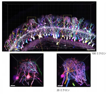 脳機能は多くの神経細胞からなる複雑な神経回路によって生み出されます。従って、脳の機能を理解するには、神経回路の配線図を理解することが必要です。近年、脳標本を透明にする手法が数多く開発され、蛍光タンパク質によって標識された神経細胞を立体的に観察することが可能となってきました。しかしながら、脳の中では数多くの神経細胞が複雑に絡み合っているため、神経細胞を単色で染色した場合、個々の神経細胞を区別して配線パターンを調べることは容易ではありません。