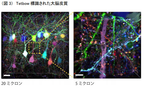 研究者からひとこと: Tetbow 法を使って得られた、神経回路の美しい画像や動画をご覧下さい。