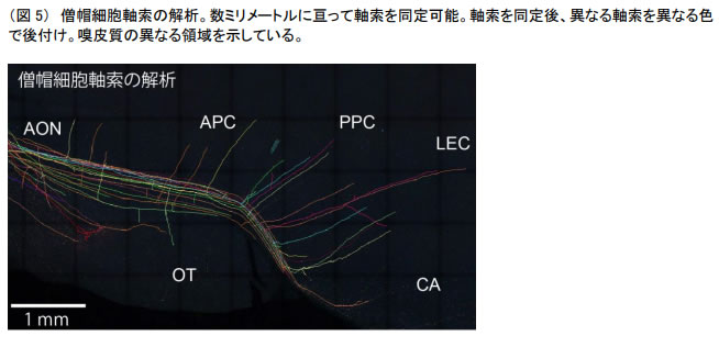 更に、Tetbow法では、長距離に亘って伸びる軸索を追跡することも可能となりました。嗅球の僧帽細胞の軸索は複雑に分岐し、数ミリメートルに亘って伸びているため、従来は追跡することが非常に困難でしたが、Tetbow法を用いることで、その全体像を観察することができました(図5)。