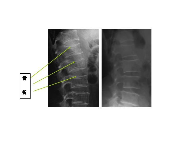 脊椎X線写真:ステロイド性骨粗しょう症患者(左)と同年代の健常者(右)。左は脊椎の圧迫骨折による変形が見られる。