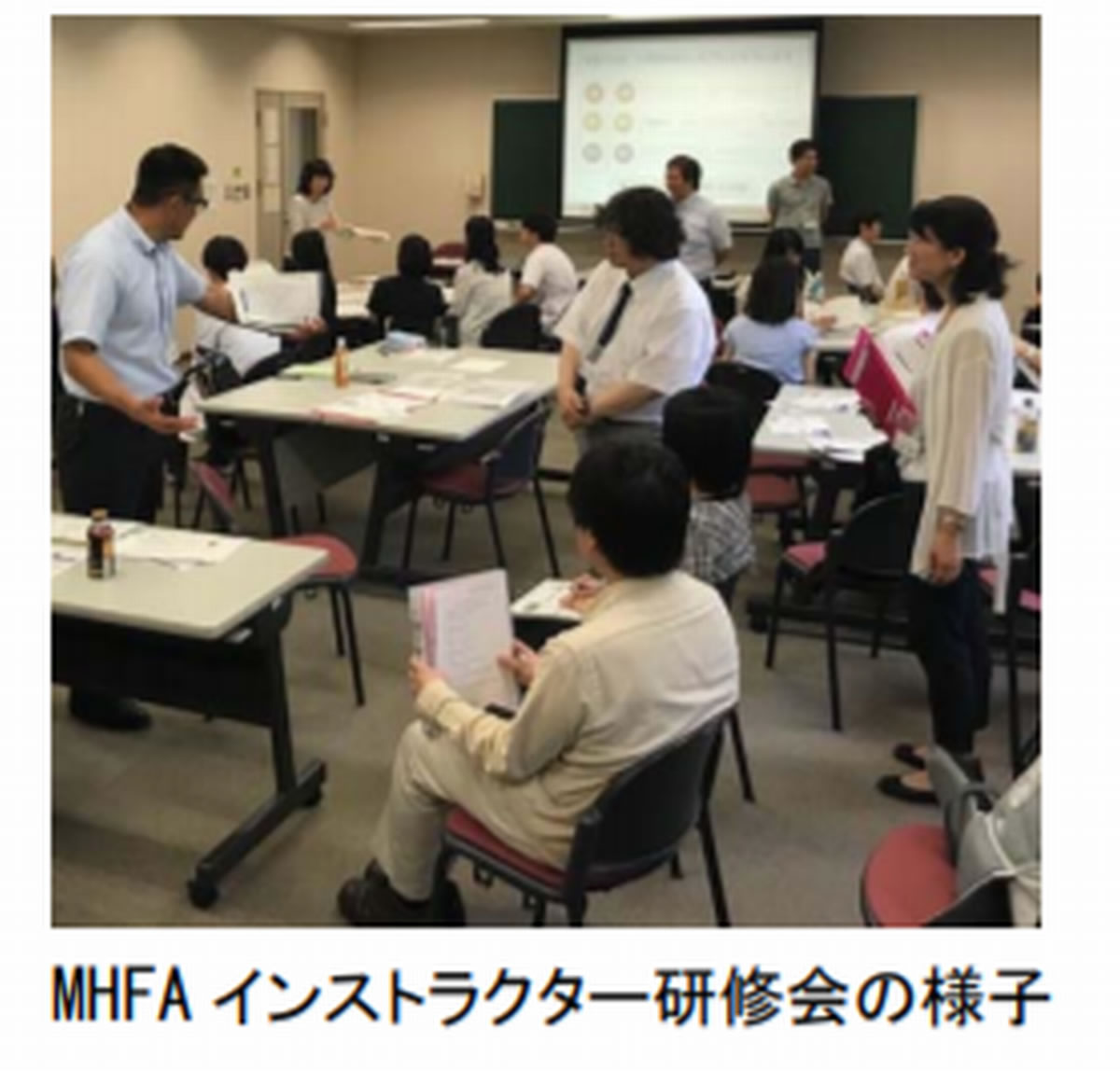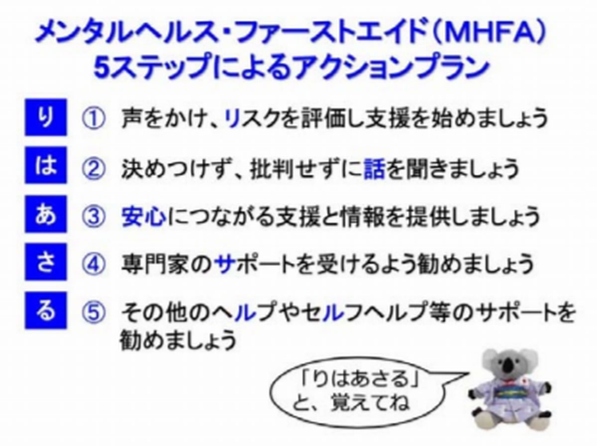| ※ | メンタルヘルス・ファーストエイド(Mental Health First Aid:MHFA)専門家に相談するまでの間、家族や友人、同僚など身近な人がメンタルヘルスの問題を抱える人に対して行う「こころの応急処置」を実践的に学ぶ教育研修プログラムです。2000 年にオーストラリアで 12 時間プログラムとして開発され、世界中に拡まりつつあります。講義だけでなく、スモールグループでの議論、ロールプレイなど体験型学習によって、具体的な対処法を習得することができます。 |