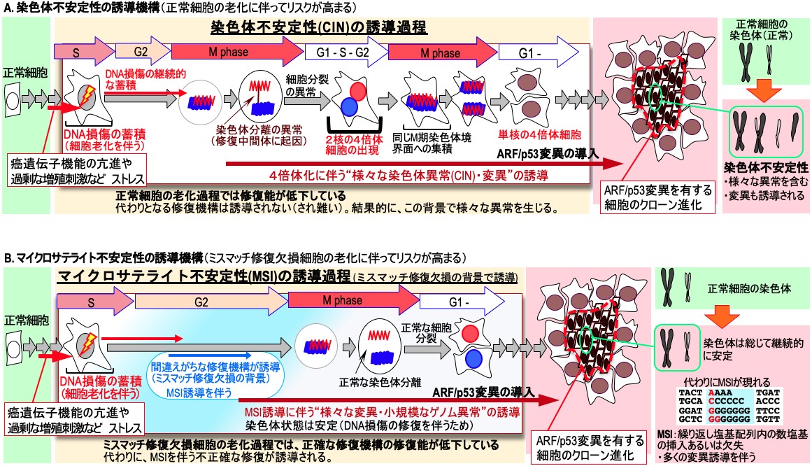 また、ゲノム不安定性は、染色体不安定性(CIN)とマイクロサテライト*3不安定性(MSI)のふたつに大別されますが、本研究において両者は相互排他的であることが示され、中高年以降に発症したがんではどちらか一方が認められることを裏付けました。また、マイクロサテライト不安定性の誘導機構も明らかになり、新たな研究展開が期待されます。