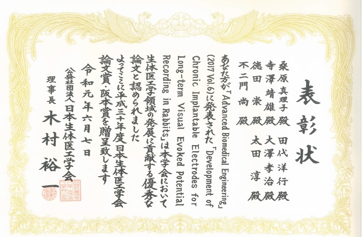 論文賞・阪本賞は、日本生体医工学会が対象とする領域において、その学問や技術に大きく貢献することとなった論文の著者を表彰するもので、毎年1編の論文が選ばれます。