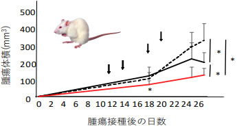 (参考図) 黒点線:無治療群の腫瘍体積 黒実線:PTPN3を抑制していない活性化リンパ球を投与した群の 腫瘍体積 赤実線:PTPN3を抑制した活性化リンパ球を投与した群の腫瘍体積 矢 印:リンパ球投与日 |