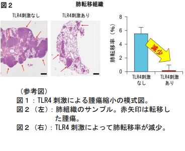 TLR4 を刺激する LPS(リポ多糖)※5をマウスに投与したところ、正常な(野生型)マウスでは TLR4刺激に伴い骨肉腫の増殖と肺転移が抑制され、結果的に生存期間が延長されました。しかし、TLR4の働きが遺伝的に失われているマウスではその効果は得られませんでした。野生型マウスでは TLR4 刺激により、腫瘍に対する CD8⁺T 細胞の活発な活動が認められました。またマウスから CD8⁺T 細胞を除去してしまうと、TLR4 刺激による骨肉腫の進行抑制効果がなくなってしまったことから、TLR4 の刺激、即ち自然免疫活性化による骨肉腫の進行抑制には、CD8⁺T