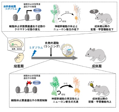 ■効果・今後の展開 発達期の麻酔薬曝露によって成体期以降の学習・記憶障害がどのように誘導されるのか、その理由は これまで不明とされてきましたが、本研究の結果から、強制的かつ長期的な神経幹細胞の休止によるニ ューロン新生の低下が一因であることが示されました。またこの長期的な細胞休止は、クロマチン状態 変化による細胞休止状態関連遺伝子の長期的な発現上昇が原因であることもわかりました。これまでの 研究では、麻酔薬暴露直後に起こる細胞への影響がよく研究されてきましたが、本研究により、従来考 えられてきたよりも長期間にわたり、麻酔薬曝露による影響が脳細胞に残存することが明らかになりま した。今後は、神経幹細胞以外の脳細胞への長期的な影響も調査していきたいと考えています。我々の 研究グループは、麻酔薬曝露後の学習・記憶障害の分子メカニズムの解明だけでなく、その治療法とし て自発的運動(ランニング)が有効であることもマウスを用いた研究により明らかにしました。このこ とは、仮に手術や臨床検査などのため発達期に麻酔薬曝露を受けたとしても、それ以降の成体期に至る 過程での治療的介入により学習・記憶障害を改善できる可能性を示しています。今後は臨床応用に向け て、ヒトにおいても自発的運動による学習・記憶機能の向上が認められるかどうかなどを調査する必要 性があると思っています。