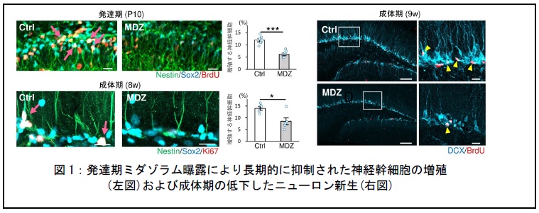発達期(P10)および成体期(8w) における神経幹細胞の増殖を免疫染色で評価した。発達期ミダゾラム曝露により神経幹細胞の増殖が長期的に抑制されることが示された(左図)。また、成体期のニューロン新生はミダゾラム曝露マウスで低下することが分かった(右図)。