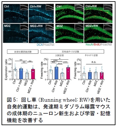 発達期にミダゾラム曝露されたマウスを4 週齢で離乳後に、回し車のあるケージに移し成体期まで飼育した。自発的運動により、ミダゾラムで低下した成体期のニューロン新生の改善(上図)、学習・学習機能の向上が認められた(下図)。
