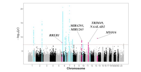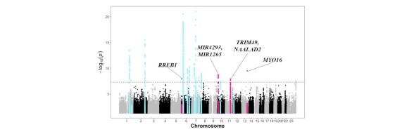 さらに、この 4 領域に関して再現性を確認するために、韓国人の SLE 患者で S-ONFH を発生している 148 人に対して、韓国人一般集団 3 万 7015 人を対照群とした GWAS を行い、さらに日本人とのメタ解析を行ったところ、3 領域がゲノムワイド有意水準を満たしました。以上の結果から、この 3 領域が S-ONFH の疾患感受性遺伝子座[4] (MIR4293、NAALAD2、MYO16)であると考えられました。