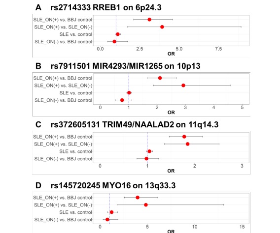 横軸はオッズ比(Odds ratio; OR)、赤点は各々の関連解析における OR、エラーバーは 95%信頼区間を示 す。縦軸は、各々の関連解析におけるケース vs. 対照群である。SLE_ON(+)が SLE 患者で S-ONFH を発生し ている人 636 人、SLE_ON(-)が SLE 患者で S-ONFH を発生していない人 686 人、BBJ control はバイオバン クジャパンの 9 万 5588 人。SLE vs. control は、過去に共同研究グループが発表した、東アジア人の SLE 患者 1 万 3377 人と対照群 19 万 4993 人の GWAS の結果から引用したもの。A~D の SNP は SLE_ON(+)と 相関しており、SLE_ON(-)や東アジア人の SLE 相関解析では相関が見られなかったことから、これらの SNP は SLE ではなく SLE_ON(+)と相関していることが分かる。
