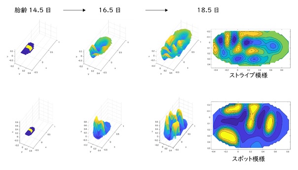 まず、上下の臼歯の形態がストライプ模様とスポット模様のどちらに近いのかを示すため、3次元モデルから形状の違いを抽出して統計的に検証し、上顎臼歯はストライプ模様、下顎臼歯はスポット模様に対応することを示しました。次に、マウスの歯胚の成長速度を測定し、この実際の成長速度をもとに、チューリング・モデルをベースにコンピュータ内で上下顎の臼歯の形態形成をシミュレートしました。そして、ストライプ模様のモデルでは上顎臼歯が、スポット模様のモデルでは下顎臼歯がうまく形成されることを示しました(図2)。