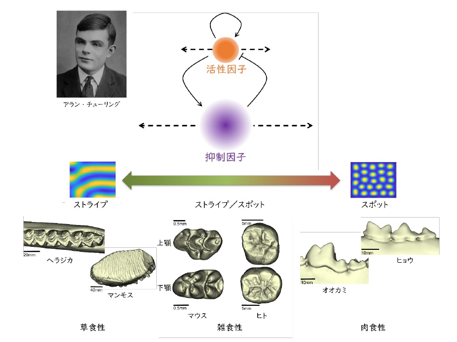 哺乳類は様々な環境に生息し食性も多様であるため、バラエティーに富んだ歯の形を持っています。歯は、様々な遺伝子が相互作用することにより形成されます。しかしその作用はあまりに複雑なので、発生過程を詳らかにすることはできていません。1952年英国の数学者アラン・チューリングは、複雑な生物の形の発生過程を、相互作用しながら拡散していく活性因子と抑制因子というたった二つの因子によって大胆なモデル化を試みました。この数理モデル(数式により現象を単純化したもの)は、チューリング・モデルと呼ばれ、一定のアルゴリズムに従って複雑な形態が自然発生的に生じます。その後の研究により、様々な生物の形態形成のモデル化が行われています。
