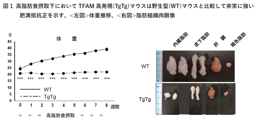 本研究では、脂肪を燃焼して熱を産⽣する褐⾊脂肪細胞を活性化させるメカニズムの研究に取り組み、活性化を促進する因⼦を褐⾊脂肪細胞⾃⾝で分泌し利⽤することで、持続的に脂肪燃焼を可能とする新たな仕組みを解明しました。 九州⼤学⼤学院医学研究院臨床検査医学の藤井雅⼀ ⾮常勤講師、病院検査部の瀬⼾⼭⼤樹 助教、康東天 名誉教授らの研究チームは、ミトコンドリアに存在する(※1) TFAM(ミトコンドリア転写因⼦A)というタンパク質を過剰発現させたマウスには強⼒な抗肥満効果が存在することを⽰し、更にそのメカニズムについて解明していきました。今回、TFAM⾼発現ホモマウス(TgTg)由来の褐⾊脂肪細胞は、野⽣型(WT)マウス由来の細胞と⽐較してミトコンドリア機能が活性化しており、より多くの(※2)エクソソームを分泌することを明らかにしました。また、WT由来の褐⾊脂肪細胞にTgTg細胞由来の培養液から抽出したエクソソームを加えて培養すると、エクソソーム濃度に応じて褐⾊脂肪細胞が活性化(⾃⼰分化)することも明らかになりました。更に驚くべきことに、TgTgマウスの褐⾊脂肪細胞をWTマウスに移植すると、⾼脂肪⾷摂取に対する著明な体重増加抑制が認められ、強⼒な抗肥満効果を⽰すことがわかりました。