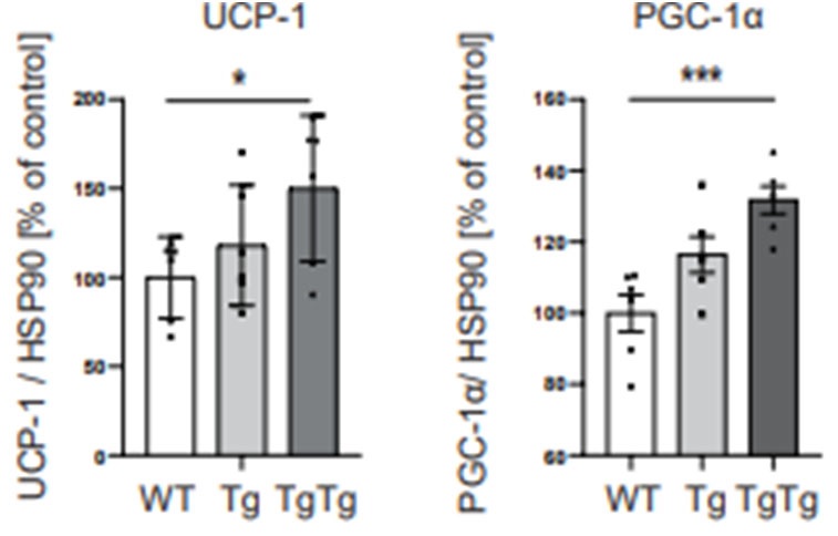 図2 褐⾊脂肪細胞活性化を⽰す熱産⽣関連 タンパク質(UCP-1, PGC-1α)発現はTgTg マウスで発現亢進している。 強⼒な抗肥満効果を有するTgTgマウスの褐⾊脂肪細胞ではWTマウスと⽐較してミトコンドリア機能が亢進しており、それに伴い褐⾊脂肪細胞活性化に必要な蛋⽩発現が上昇していることが分かりました(図2)。次にTgTgマウス由来の褐⾊脂肪細胞⾃体が抗肥満効果に影響を及ぼしていることを確認するため、TgTgマウス褐⾊脂肪細胞を抽出・培養し、WTマウスの褐⾊脂肪組織付近の⽪下に移植したところ、⾼脂肪⾷摂⾷下においても体重増加抑制が認められました。