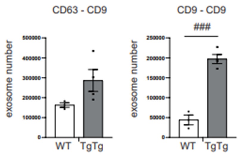 図3 TgTg 由来の褐⾊脂肪細胞はWT 由来よりも著明に多くのエクソソームを分泌している。 そこでTgTg 由来とWT由来の褐⾊脂肪細胞に培養液を交通させて共培養を⾏ったところ、WT由来の細胞においてでも褐⾊脂肪細胞が活性化していました。興味深いことに、TgTg由来褐⾊脂肪細胞ではミトコンドリア機能の亢進によりエクソソームの細胞外への分泌が著明に増加していることが今回確認されました(図3)。したがって、この過剰分泌されたエクソソームがWT由来の細胞に培養液を通じて到達し、活性化に寄与しているという新しい褐⾊脂肪細胞活性化のメカニズムが今回の研究で明らかになりました。