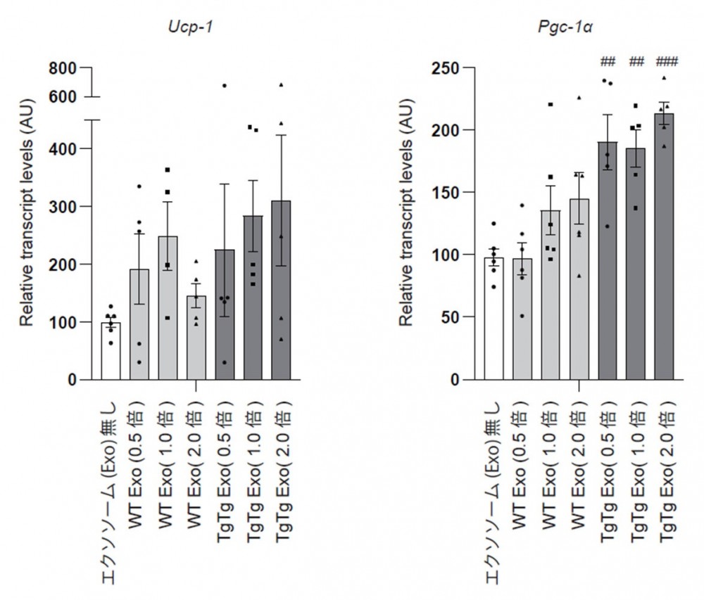 今回の検討により、⽣体内に⽣理的に存在するエクソソームによる褐⾊脂肪細胞活性化メカニズムが解明されたことで、肥満治療に求められる安全性・有効性という重要な条件を満たす新たな治療戦略が⽰されることとなりました。今後、エクソソームを始めとする細胞外⼩胞の分泌促進に寄与するミトコンドリア活性化剤や安定的なエクソソーム回収法の確⽴等により、根治的肥満治療法の開発へ⼤きく貢献するものと考えられます。