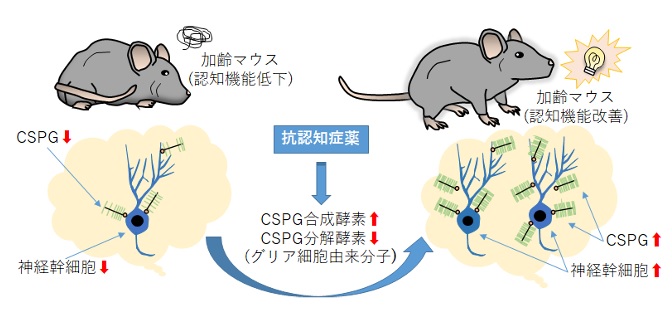 研究成果の概要図神経幹細胞のニッチであるCSPGの合成酵素や分解酵素はグリア細胞由来の分子です。今回の研究で、それらが神経細胞の産生を促進し、加齢による認知機能低下を改善する鍵を握っていることが分かりました。