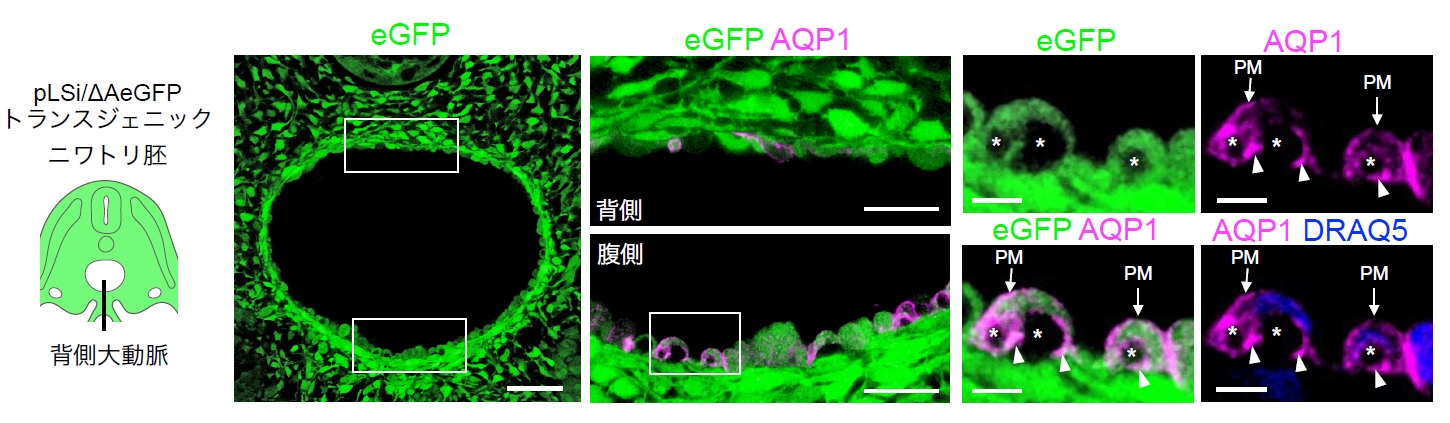 背側⼤動脈(※3)の腹側部を構成する⾎管内⽪細胞が内⽪−造⾎転換をおこす。これらの造⾎性⾎管内⽪細胞は液胞(*印:緑⾊蛍光タンパク質eGFP 陰性の領域)を有する。AQP1は造⾎性⾎管内⽪細胞の細胞膜(PM)と液胞膜(⽮頭)に局在する。