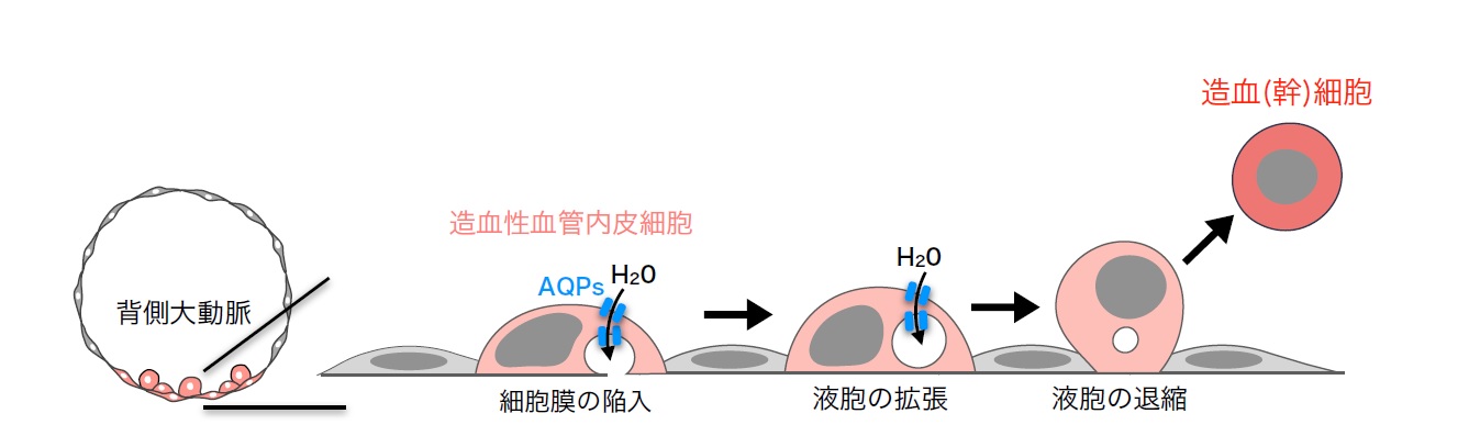 造⾎性⾎管内⽪細胞は複数のAQP を介して⽔分⼦を取り込むことで液胞を拡張して球状化する。球状化の過程で造⾎幹細胞(もしくは造⾎細胞)に分化転換し、⾎管壁から遊離して⾎流循環する。【⽤語解説】