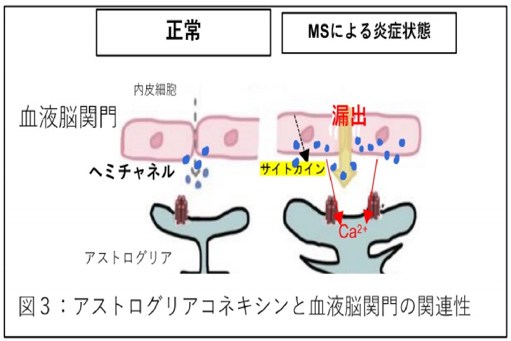 私たちは、二次性進行型MS患者の脳幹病変部で、アストログリアという脳細胞同士を繋ぐギャップ結合蛋白コネキシンが過剰発現していることを見出しました。この蛋白は細胞表面でヘミチャンネル(物質を細胞内外でやりとりする門)を形成することもわかっており、この過剰発現が二次性進行型MSの病態と関係していると考えました。