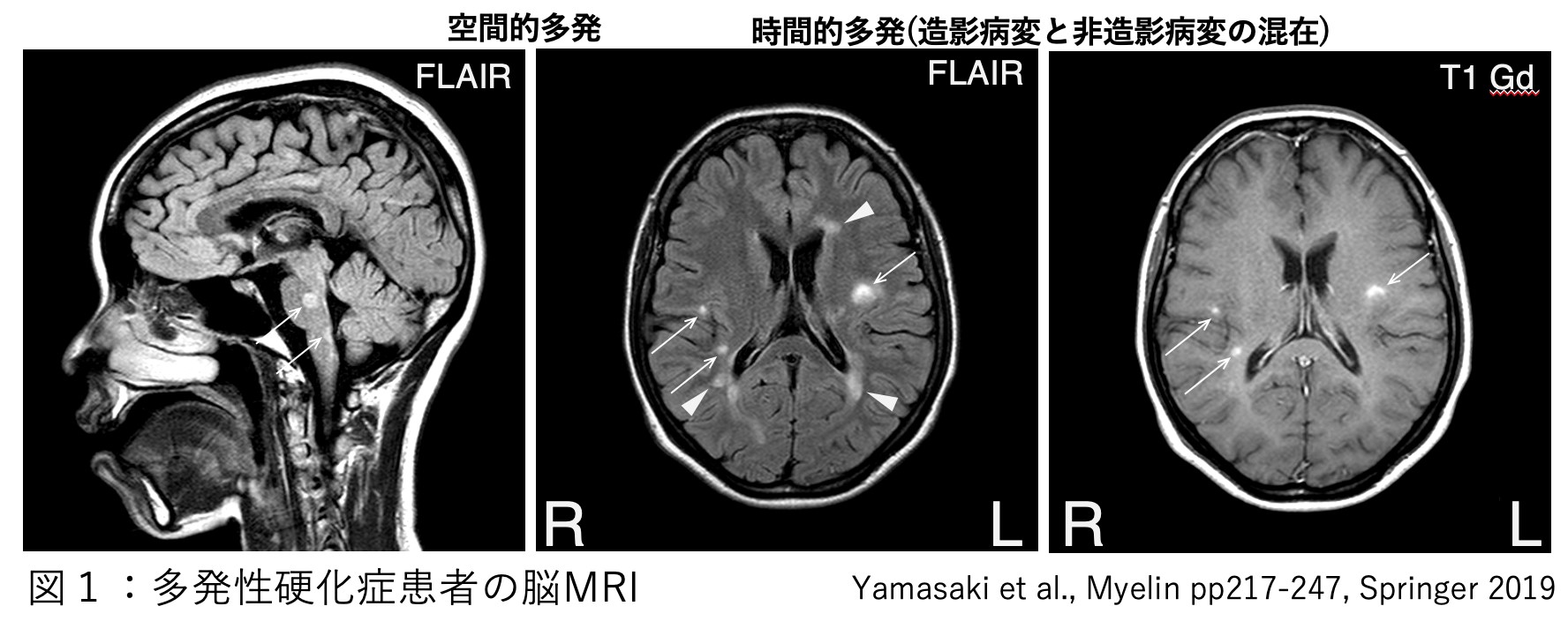 MS患者は、脳脊髄に多発性病変を生じ、活動性の病変部は造影されます(図1)。MSの病変部では、脳脊髄の神経を被覆している髄鞘(ミエリン)に対する自己免疫反応により髄鞘が破壊され(脱髄)、神経伝導の障害をきたします。脱髄を繰り返したり、脱髄が遷延したりすると、露出した神経線維自体にも障害がおよび、不可逆的障害をきたすこともあります。MSの多くは再発と寛解を繰り返す再発寛解型MS (RRMS)の経過をとります。一部の症例では、経過中、再発によらない病態の進行、障害の蓄積が生じ、二次性進行型MS(SPMS)に移行します(図2)。