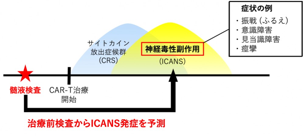 図1: CAR-T 細胞治療開始前に採取した髄液検体を用いて、CAR-T 輸注後の神経毒性副作用 (ICANS) のリスク予測を試みた