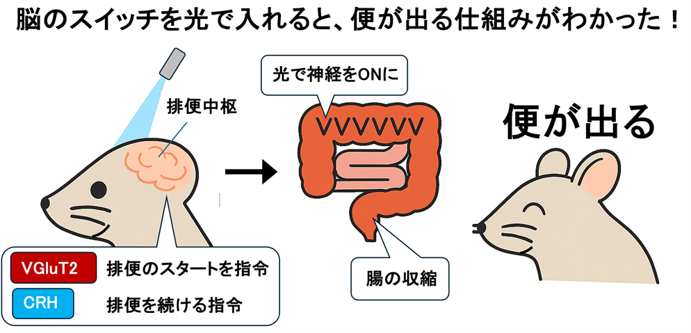 - 最先端の神経科学的手法を用いて排便をつかさどる脳中枢の仕組みを世界で初めて解明した