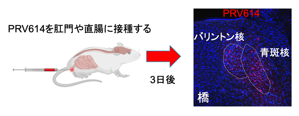 まず、神経軸索を逆行性に移動する性質を持つ「仮性狂犬病ウイルス*5 (PRV152, PRV614)」を遺伝子改変マウスの肛門および直腸に注射し、脳内の排便中枢を探索しました。その結果、バリントン核と青斑核 (Locus coeruleus: LC)*4 が排便制御に関与している可能性が示されました (図2)。